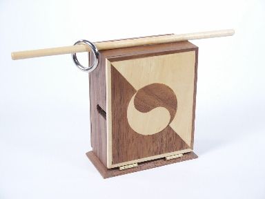 A wood chop stick is placed through holes in the side walls of the cabinet in a horizontal fashion and left with an even measurement of chop stick extending from both sides. The doors are lowered and the ring is seen to have magically penetrated onto the solid stick!