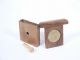 A year 2000 Golden Dollar US coin is placed in a well of a walnut wood slide with handle that also has a smaller hole on its underside. The slide is placed into a walnut wood case that has a small hole bored through its center. The coin is visible from the front and rear sides of the case by the spectator prior to positioning the case at a horizontal level.