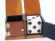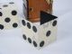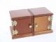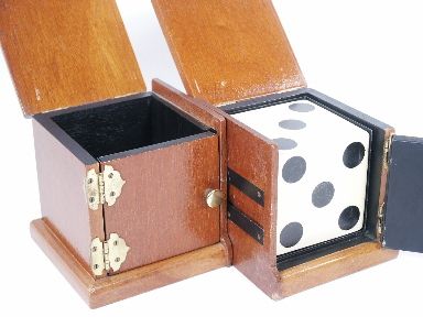 The original early box as made by the Owen Brothers with each half having its own sliding sound mechanism and double door feature. After the basic routine with the die box the magician takes the halves apart and he and his assistant move to opposite sides of the stage. The magician makes a tossing motion with his half to the one held by the assistant and it is found within the assistant's half! After this the die will vanish only to be discovered in another location. The standard four sided shell has paint absence otherwise the entire unit is in very fine condition and a difficult item to find. | |