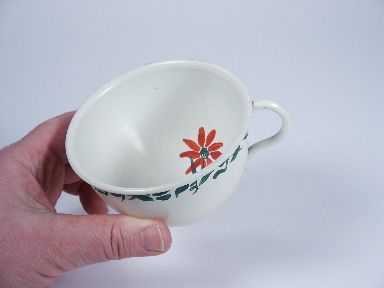 One of the earliest examples of this finely constructed cup deceptive by design allowing for the liquid to reappear after emptied. Hand painted floral over white enamel on copper. A very well made piece of apparatus from Richard Himber. Condition very fine. | |