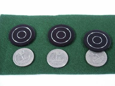 Made in Great Britain by a master of precision made machined coin effects and with U.S. quarters. Three black anodized metal covers a silver quarter and two copper pennies make for an interesting routine described in three pages. This is one that packs small and plays big for entertainment as gambling themes always seem to entice. Condition very fine. | |