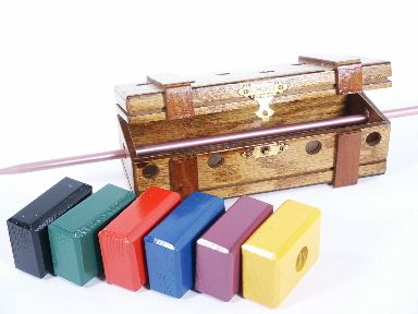 Spectator selects any two of the six different color blocks and blocks are placed in cabinet and a metal rod inserted which holds all blocks as each one has an opening. The spectator names aloud the two selected colors and the lid is opened and while held by ends of the metal rod the two selected blocks fall away to the table leaving the other four still firmly impaled! Includes instructions. Cabinet is 7" wide x 3 1/4" deep x 2 5/8" high. Condition very fine. | |