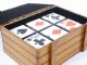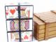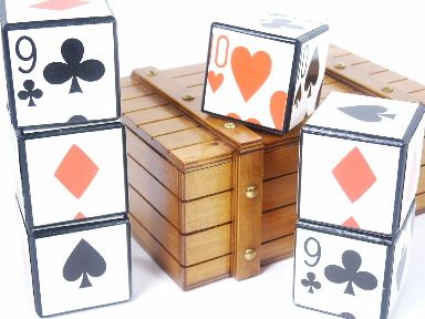 From a handsome chest measuring 7 1/2" wide x 5 3/4" deep x 3 1/2" high the magician removes six cubes each 2 1/4" in size and stacks them atop one another forming a stack showing different sections of card.