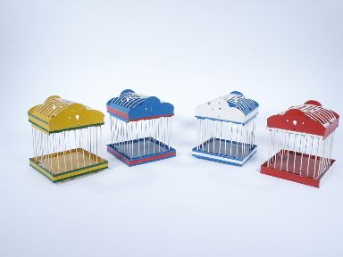 Four metal cages which fold flat yet when lifted by handle will fold down and out into ridged cages. Ornamental tops have slight bends. Condition very good. | |