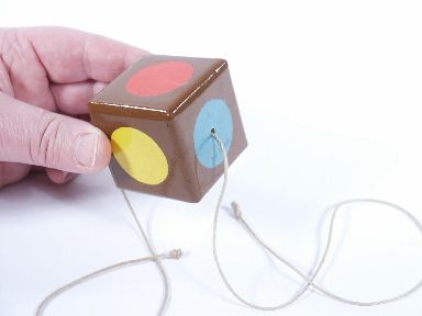 This 1 7/8" block of wood will stop and start on command as the cord is held vertically between the magician's hands. Painted as issued and a patent stamp applied on the blue spot. Includes instructions. Condition very fine. | |