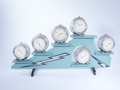 From Mephisto Huis in the Netherlands comes this 6 Alarm Clock Production along with Display Stand as the clocks are produced that enables the ringers to be heard as the production is made. The area for placement of battery is made for a European system however a 9 volt battery was used on the contacts to test the ringers. Condition very fine. | |