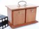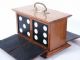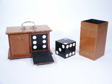 Doors front and rear two shell dies with hinged doors sounding mechanism that may be stopped at the will of the performer leave one to say what more can one ask for? The die is 3 3/8" in size and all made of wood with inlay spots. Escutcheon plate of handle on top of die box has some surface rust otherwise very fine condition. | |