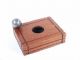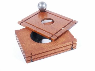 A similar type apparatus from Joe Berg had to do with a color chip divination and this handsome Mahogany piece is made for the penetration of a steel ball bearing through any coin 34 mm or less in size placed within the well. After the coin is placed within the well and the panel is moved in place over the coin a steel ball bearing is placed in the smaller opening atop and it is seen to sink and melt through the coin coming out the bottom of the case! Immediately the case made be held up to show the coin blocking this passage way and the top portion is slid away giving a full view of the coin still in place. This is a beautiful mechanical piece and one in very fine condition. Instructions for the working of the mechanics included. A Rare Joe Berg item. | |