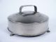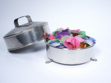 Beautiful antique styling with Lions paw feet well crafted in metal quality throughout. Heavy gauge metal with nickel finish. Includes spring flowers. Patina inside bottom of pan. Condition very fine and desirable. | |