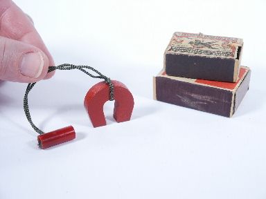 A small horseshoe magnet on the end of a string is shown and held over the backs of the cards and touched to them one at a time where suddenly one of the cards sticks to the magnet and is lifted up by it with the magician requesting the spectator remove it from the magnet and it is found to be the selected card!