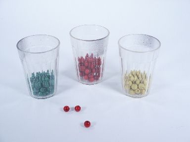 A number of years ago this came out using two tumblers and two different colors of beads which were mixed together and yet with ease on the part of the magician of course the beads were separated by color into the two tumblers. This set has 3 tumblers with colors of beads being red green and yellow. No instructions but once you have in hand it will become apparent as to the working. Condition very fine. | |