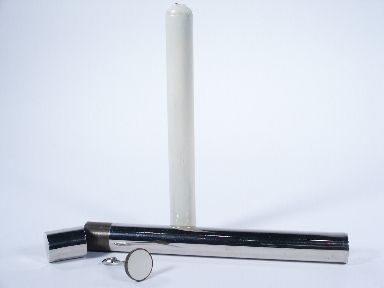 This has a candle which measures 8 1/4" along with a nickeled case with cap and the addition of an end piece painted white so that once the candle is lit and placed in the case the end may be shown for a moment prior to closing with the cap. For the reveal of the candle vanish the end piece is stolen away by friction fit within the cap and an extractor tool is included for removal of this end piece. Condition very fine and European make. | |