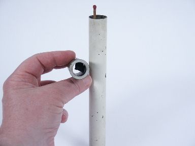 A candle made of metal with unique construction measuring 7 11/16" that may be produced from coat pocket lit. A very interesting arrangement that is clearly shown in the German instructions illustrated. Condition very good. | |