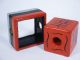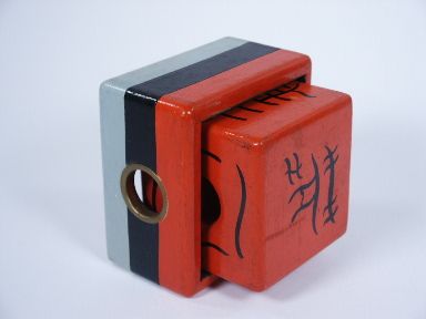 A classic early painted wood effect of a block making its escape while secured with a ribbon (not included) within the wood frame with brass grommets. The block is nearly 3 3/4" in size. Includes German instructions illustrated. Condition very fine. | |