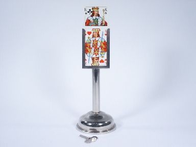 From the styling to the meticulous attention to detail of construction this is one piece that will take your breath away. The key is used to set the tension in the motor for the rising of the cards and by simply releasing a bayonet catch on the plunger the card will come up and away from the pack in the houlette atop the column. The houlette has a very fine die stamp Germany on both sides of the upright portion. Includes Cards shown. No instructions. Condition very fine and it is worth repeating Beautiful. | |