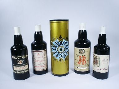 Believe this to be Magiart Portugal and the tube stands 12 3/4" high with a diameter of little over 4 1/4". The nest of four bottles are in metal and look just like the real thing. Condition very fine. | |