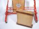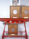 The display stand is 41 1/2 inches wide x 29 3/4 inches high with the base 20 inches deep. The three wood sleeves housing the cards with their gimmick sections travel in a fitted wood case and the display stand on casters breaks down for transport. A lower section on the display stand allows for placement of a sleeve with card or of course the card alone.