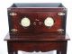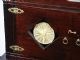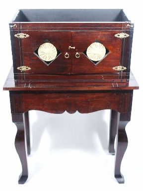 This vintage piece built of wood with its shellac finish is a stand alone highlight piece for a collection. This measures 39 1/2 inches high x 16 inches deep x 28 inches wide. In the days when thread was the motive power for many things magical this cabinet is built specifically with tolerances to allow for running threads in several directions and especially for that of a handkerchief with a life of its own. What you have is a base with Queen Anne style shape legs along with a platform base which sits atop and a cabinet open at top with two doors that open giving a view of the fairness within. A hidden secret panel in the platform and one in the cabinet gives access to a secret chamber into which the unprepared handkerchief is placed. The chamber is made of material that will drop through the cavity in the platform and is hidden by the apron of the table base so that dimensional objects may also be contained within. Another small panel within the secret sliding panel of the cabinet itself allows ample room for the gimmicked handkerchief to be concealed and a simple tug on a thread will bring the gimmicked handkerchief out of its hiding place. This is a magnificent and rare piece of apparatus that speaks volumes of the time period in which it was built for use. This is the Granddaddy of Casadegas and in very fine condition. | |