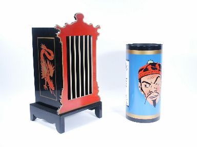 Standing nearly 20 inches high upon its base this has come to be known as one of the more sought after pieces of this type for its style and decoration. The size of load is 6" diameter x 12 3/4" deep or high. The black art effect is perfect for concealment. Aside from light touch up primarily on the black edges this Hamilton piece in very fine condition. Anything near comparable today and there isn't would sell for around $1,000. | |