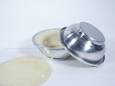 White enamel interior bowls with celluloid gimmick and both bowls are trademark stamped with the large trademark. Includes instruction. Condition very fine. | |