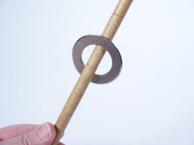 A 14" wood dowel of just under 1/2" diameter along with 2 rings of metal just under 2" in diameter but also with the special addition of magnetic principle near the center of the dowel adding a new dimension to Ring and Stick penetrations for the Close Up Worker. Similar to Ken Brooke Rings and Dowel. Close examination gives absolutely no indication of it being anything but solid wood. A very well made item from Europe. No instructions. Condition very fine. | |