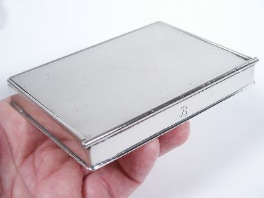 Another exceptionally fine metalwork item crafted by P&L Magical Manufacturing Co. (Petrie Lewis) and this one in perfect working order and I can think of nothing more deceptive for use in the exchange of one card for another be it for torn and restored or some other diabolical creation of your own. The beauty of this box is that it may be closed in front of the spectator and without any suspicious moves be placed in their own hands for the duration of the effect until the ultimate reveal which they themselves cause to happen by their own opening of the box! This is not a regular flap style box but rather one made after the style of Roterberg of which a description may be found in Roterberg's 1897 New Era Card Tricks. Very minor blemishes on this Cupro Silver Box otherwise very fine condition also bearing the trademark stamp of P&L a mark of quality. Includes instructions. I waited along time before acquiring my P&L Card Box all you have to do now is bid. | |