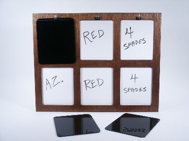 The ever popular Hen Fetsch Mental Epic rendered in mahogany wood with dry erase material instead of the old slate and chalk. Measures 19" wide x 15" high along with nicely made covering panels of black plex that have routed grooves enabling a nice grip of the clips. Board is 1/2" thick. Includes instructions and from 1990. Condition very fine. | |