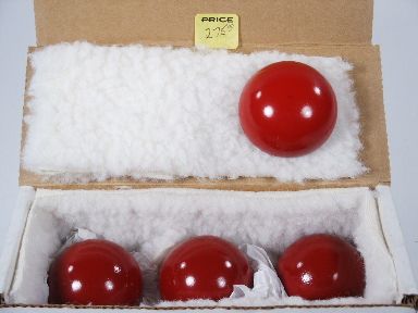 The box these were contained within had a price of $275 and handwritten Owen's Magic. The interior of cardboard box has craft type fur material cut and glued inside. What you have is a shell with a hairline crack measuring 3/4" and it does not match in color the solid 3 balls very well. Overall condition is very good but I must say I do not believe these to be Owen's manufacture. | |
