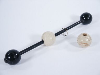 A ring is vanished and then an ivory white ball is handed for examination. A rod with two knobs is shown and one of the knobs is removed and the ivory ball is placed on the rod and the knob put back in place having a spectator hold the rod at both ends. A cloth or handkerchief is draped over the ball and when removed the ball has vanished leaving in its place the vanished ring!