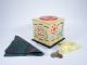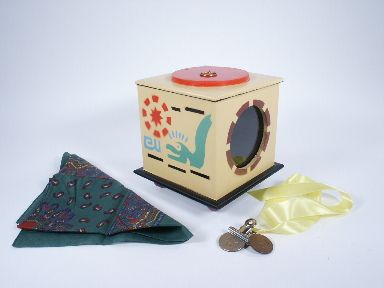 A Scarce Clint Reidel effect that is unlike any other version of a vanished coin found elsewhere type effects. A chest with Aztec designs measuring 6" x 6" x 6 1/2" high is given to a spectator to hold at the very beginning of the effect and it is seen to be filled with puffed rice. A half dollar which may be borrowed and marked by the lender is covered with a hanky and held by the lender. The chest is taken and shown all sides and given back to the spectator to hold and the magician waves his wand causing the half dollar the lender is holding turning into a real Mexican 20 centavo coin. The spectator holding the chest is asked to remove the lid of the chest and an end of the ribbon is seen sticking up out of the rice. The spectator is told to pull up on the ribbon and at the other end of the ribbon is a metal clip with the same marked half dollar held tightly in its grip! The rice may be poured out of the chest and the chest shown all around. This includes *coins *a colorful scarf and *ribbon with clip attached all you supply is the puffed rice or if desired you may also use beans. Let me remind you that the spectator holds the chest before and during the effect and this may not be done with any other version of this effect. Mr. Riedel passed away in 1995 and this scarce item predates his passing by many years. Includes instructions. Condition beautiful. | |