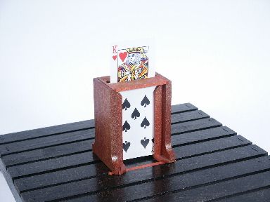 A slat style tray along with houlette and deck of cards make for a pretty amazing effect of selected cards rising one at a time followed by examination of all! What makes this even more incomprehensible is the fact that a handkerchief or silk is placed over the tray prior to the placement of the houlette disproving any notion of a connection between the tray and the houlette with cards. Includes cloth carry bags for tray and houlette along with cards and two pages of illustrated instructions with patter for the Val Evans' Rising Cards. Handkerchief or silk not supplied. Condition of all very fine. | |
