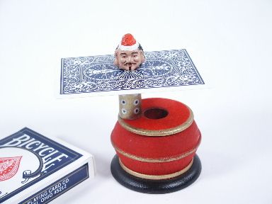 From Great Britain comes this charming close up wonder that is sure to please as it creates a sense of animation upon the table among the spectators. After a card is selected and returned to the deck with a shuffle the magician will cause the selected card to come to the top of the deck. Saying so he gives the deck a shake and turns over the top card but it is found not to be the selected one. Certainly in trouble the magician takes the top card and places it face down upon a pedestal saying he will need the help of a little friend he carries with him just in case this should happen. He brings from his pocket a small head figure but one with no body. His little friend can indeed help him and he drops the head onto the face down card upon the pedestal and mind you this is done from a few inches above. Suddenly the card and head are seen to both jump up from the pedestal with people all around wondering what has just transpired. The magician states his little friend has yet to fail when called upon and the magician reaches for the pedestal lifting it up and asking at the same time that the selected card be named and as it is the spectators now see the head and body with the card sandwiched between and it is indeed the correct selected one! You will derive a great deal of enjoyment from this piece and other ideas for use are given in the instructions which accompany it. Also includes a deck of Bicycle cards. Condition very fine. | |