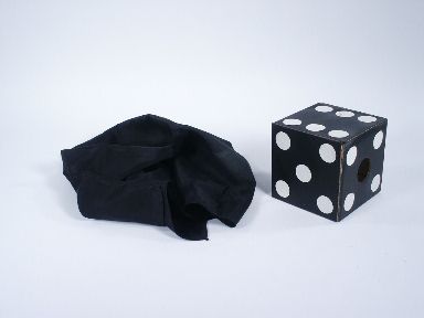From Sweden. This large 4" die without spots is draped with a black silk with spots and with your wand (not supplied) the silk is made to pass through the die and as it appears on the other side the spots have vanished from the silk and are now on the die! Includes illustrated instructions. Condition good with light wear to die. | |