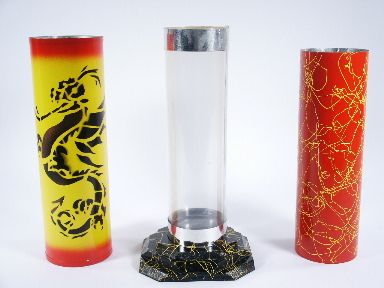 Not only does this look magical by its Dragon Design on the cylinder but it serves a useful purpose as it makes for a clever transformation of a few silks dropped within (not supplied) into that of a cylinder full of solid objects of your choosing such as fruit - ping pong balls or the like as a matter of fact it may be items having something to do with the group you are entertaining. The addition part to this is yet another cylinder opaque in construction that is placed over the crystal transparent part prior to covering with the outer cylinder. A UF Grant item. Includes instructions. Condition very fine. | |
