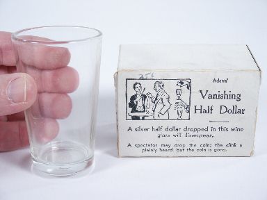 The handkerchief would be pulled away and peering into the glass you would see nothing and as a further enhancement another empty glass brought into play and the glass with liquid turned over and poured into this other glass! The coin has vanished.