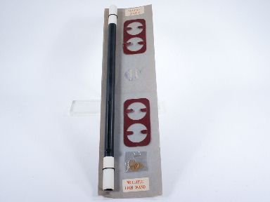 From many years ago produced under the name of Satan Magic this is still on the original card but absent the four folding coins which to my memory were of an inexpensive quality at the time. Standard folding half dollar size coins will suffice. Condition very fine.