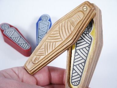 A coffin made of beautiful hardwoods with a mummy design within the wood on the lid along with three different color mummies. A spectator is asked to place anyone of the mummies within the coffin while the magician is not looking. After this is done the magician is able to correctly say which mummy was placed within! This is really made nice and includes illustrated instructions. Condition very fine. | |
