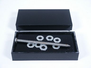 Circa 1985. Opening a box the magician shows a nail and a washer showing that there is no magnetic attraction between the two. Taking the nail between his hand he rubs it giving it the power which is now used to pick up the washer with the point of the nail! The spectator is handed the nail along with washer but is unable to get the same results as the washer will not adhere to the nail! An unusual and clever Anverdi made item. Includes instructions. Condition very fine. | |