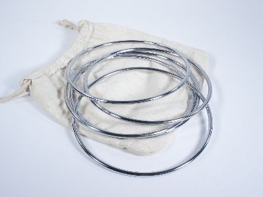 A beautiful set of 8" linking rings consisting of *two singles *set of two *key ring. Includes cloth drawstring bag for carry as well as to keep them nice. Condition very fine. | |