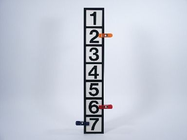 Said to be a new version of the Clip Prediction outstanding by the simplicity of method and easy to do. Showing a long narrow strip of numbers the magician holds it in a vertical position and asks spectators to indicated numbers where the different color clips are to be located. When turned around it is seen the audience have correctly clipped the correct locations of the colors! The strip of numbers is 20 1/4" long. Condition very fine. | |