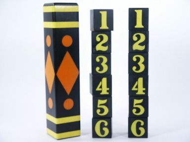 Enjoying a great deal of popularity among the few that have the effect this is the stack of six numbered blocks along with a duplicate stack and a tube to cover one stack from view. Blocks arranged in any fashion and the other stack magically follows suit. An early set made of wood and metal along with directions. A much sought after set from many years ago. Condition very fine. | |