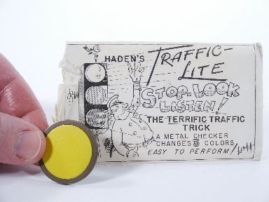 A precision made metal checker is used to signify a traffic light. It is first shown as yellow then it changes to green and then to red which may be shown both sides and examined by a spectator! Conrad Haden known as a specialist with making precision gimmick coins manufactured this in brass and an unusual feature of this piece is that it has another regular brass checker that is all red. Includes illustrated instructions. Condition very fine. | |