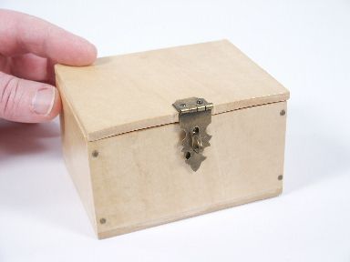 Box measures 4" wide x 2 2/8" high x 3" deep having a hasp closure which a lock may be used but not provided. A previously vanished item may be made to appear within this as a locked unit. Access is by a right hand secret panel. The lid has a slight hump not affecting working otherwise decent condition. | |
