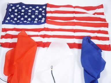 Three silks red white and blue change into a flag and pole (using an appearing cane that you already own). Includes instructions. Condition fine.