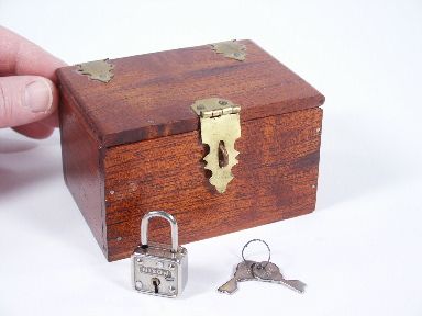 Made of solid mahogany wood with brass hardware and lock and keys measuring 4" wide x 3" deep x 2 3/8" high having a left hand panel access. Condition very fine.