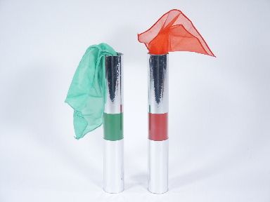 Two metal looking tubes shown empty with one having a red band painted around its center and the other having a green band. A red silk placed into the tube with the red band and a green silk into the green banded tube. Magician takes one tube in each hand and commands the silks to change places. The red silk is blown from the green tube and the green silk blown from the red tube with no clue as to how this was accomplished.