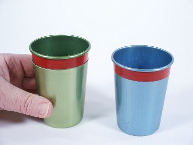 After these 2 cups are shown empty they are placed mouth to mouth then the magician speaks about a little moisture being produced in the cups. They are taken apart and now water is poured back and forth between the two! Includes instructions. Cups are of metal showing a little use but work just fine. | |