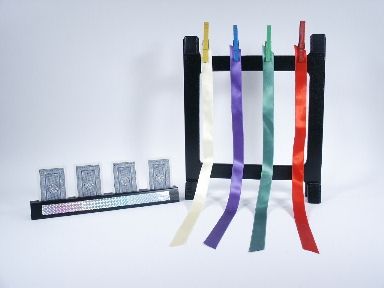 Upon a frame measuring 14" high x 11 3/4" wide are seen 4 different color ribbons clipped to the top horizontal bar. Also nearby a rack with 4 cards held in upright position. With the magicians back turned to audience a spectator is invited to come up and remove one card from the stand show it around and replace it in the stand followed by the magician turning back around to face the audience. Holding the frame in hand the magician asks the spectator to think about the card which indicated a specific color and suddenly the clipped ribbon flies off much to the surprise of everyone! This continues with the remaining 3 colors. Instead of solid color cards there are blank face playing cards for the names of the colors to be written upon or perhaps large self adhesive color dots to be placed upon. Includes 3 pages of illustrated instructions. The stand has a clever mechanical arrangement. Condition very fine. | |
