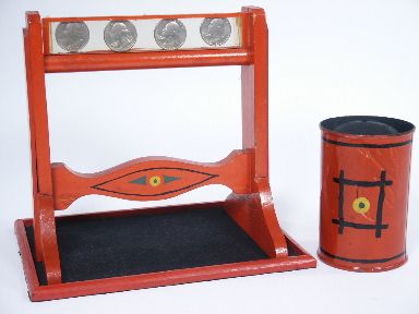 The bottom of the crossbar of the wood stand has had a glue repair otherwise over all condition good. The container that the coins are placed within being made of metal has a few small dents. Coins not supplied. Includes covering silk and 2 pages of illustrated instructions for this mechanical handmade piece of apparatus.
