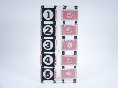 Based upon an effect of many years ago by Corinda this improvement is a clear plex board 15 3/4" high x 7 3/8" wide having bands of elastic which hold 10 cards and on one side of the board are numerals 1 through 5. Also included are 2 matching sets of ESP Cards 10 in all. One set is mixed and the magician places one card beside each number on the board back design to the audience. After this is done the remaining 5 ESP cards are mixed again and they are held one at a time also with backs facing the audience with magician asking what number each card should be placed underneath. After all the cards have been placed the board is turned around showing that two complete strangers have matched perfectly the 5 different ESP designs! Includes instructions. Condition very fine. | |